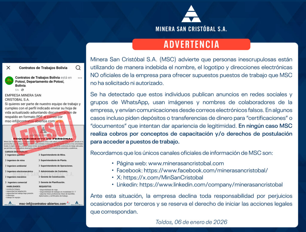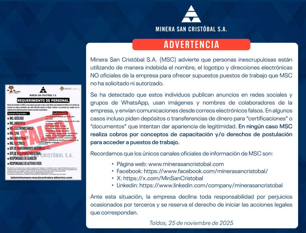 Minera San Cristóbal monitorea permanentemente la calidad del aire, agua, suelo, emisiones sonoras, condiciones socioeconómicas y ecológicas, con la finalidad de prevenir impactos.